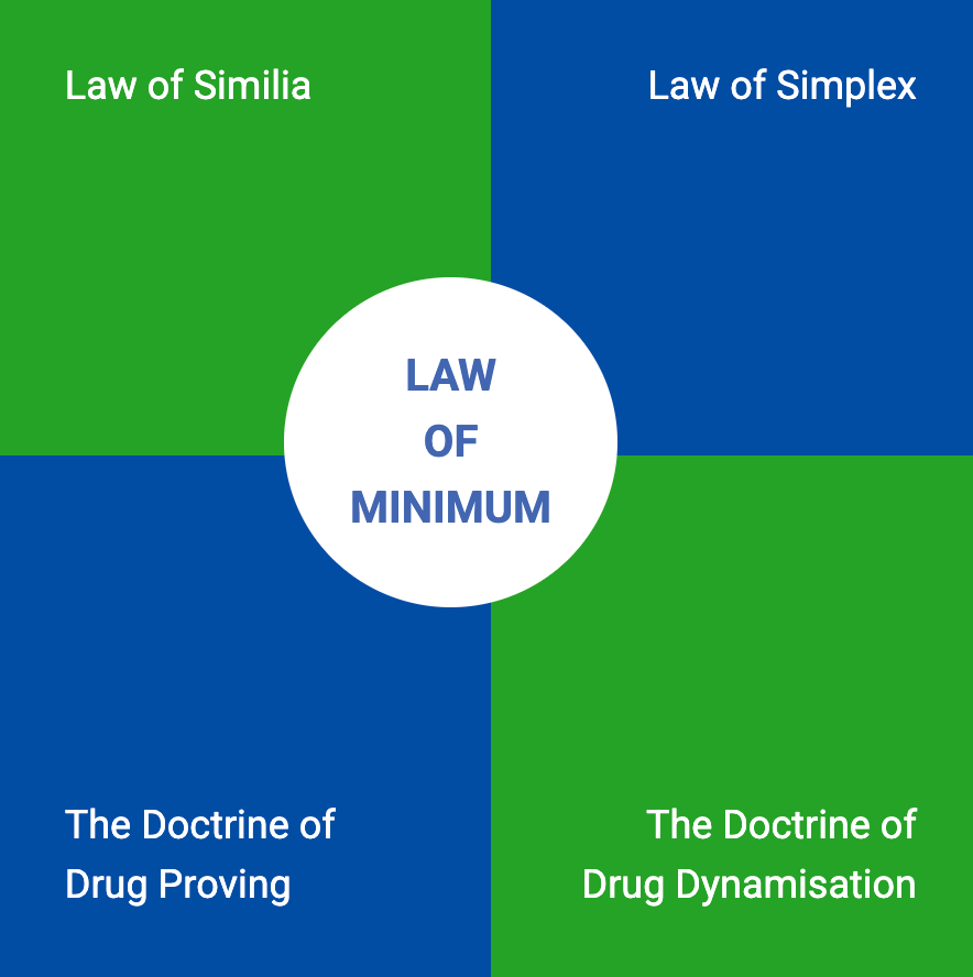 Law of Minimum: – Using the minimal amount or the smallest quantity of medicine which is sufficient to produce an artificial disease on the vital force is similar to the natural disease.